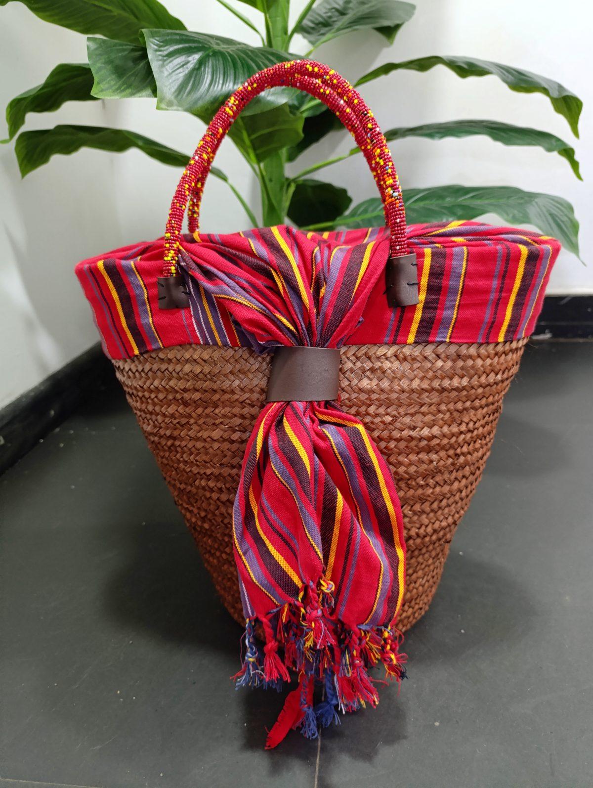 The Malkia Basket is a palm leaves Basket dyed brown using natural dyes and with a Kikoi Fabric as the Top Covering . The handles are made using High quality Beadwork to enhance Longevity and functionality. There is a variety of Colours to choose from and the size is 14*12 inches making it spacious enough for shopping and other errands.