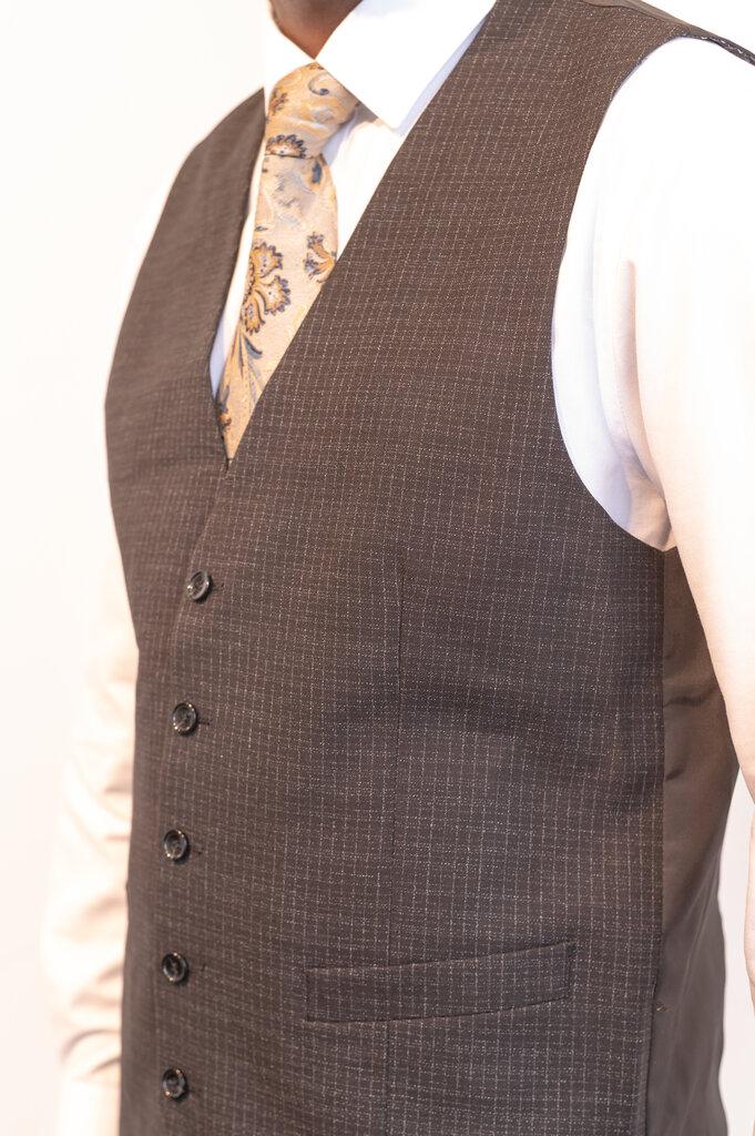 Make a lasting impression with our sophisticated three-piece suit in a versatile black shade. The fabric features a refined, subtle check pattern that adds texture and depth without overpowering.