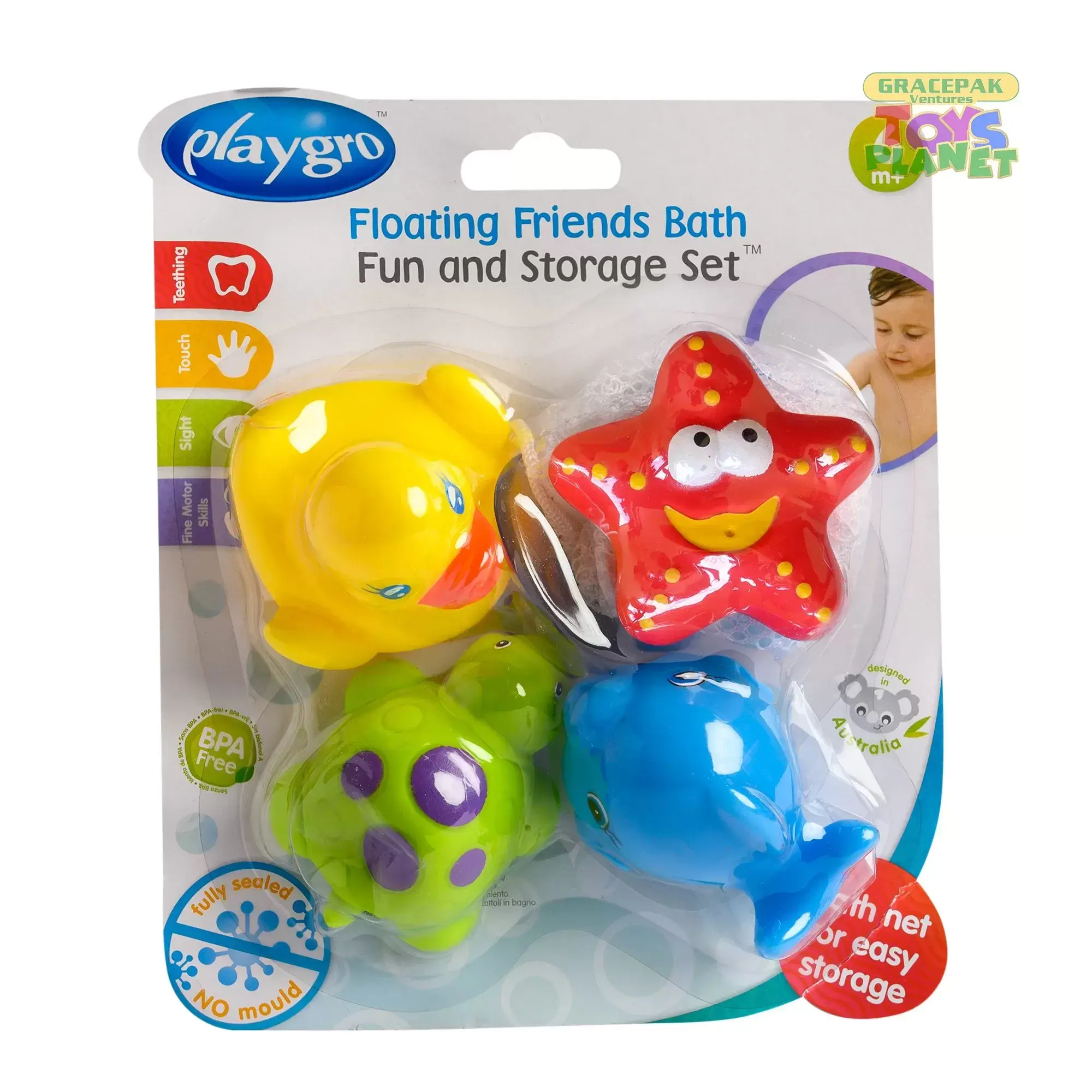 Float, splash and store our Floating Friends Bath Set! Features four brightly coloured water characters together with a convenient mesh storage bag. Duckie, whale, turtle and starfish are completely sealed to prevent mould developing inside and safe for baby to chew! Perfect for imaginary water play and bathtime fun and sized for little hands. Storage bag simply suctions to the wall to keep toys dry until next time.