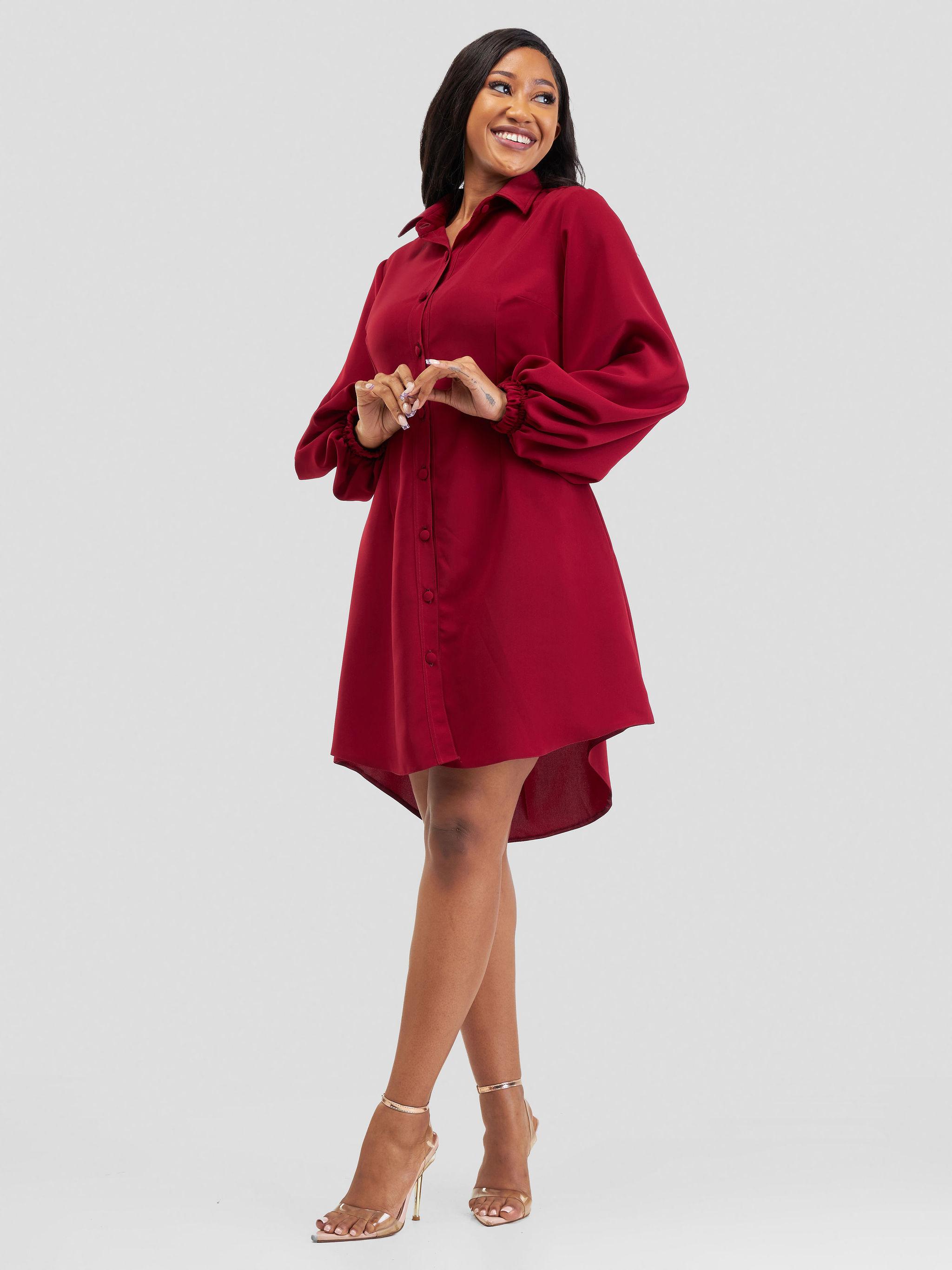 shirt dress, knee length, long sleeved with elastic band, pockets